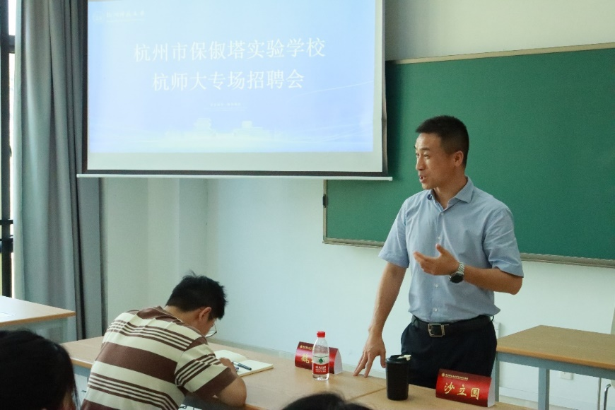 接着,沙立国校长向在场的同学们详细介绍了保俶塔实验学校的办学理念、历史沿革、校园文化及生源状况等。他强调,学校十分注重学生的全面发展和个性培养,办学声誉受到社会的普遍肯定,此次专场招聘会着眼于为明年招聘储备人才,并详细介绍了招聘计划和相关要求。在之后的交流环节中,沙校长积极回应同学们的提问,并就毕业生们关心的问题进行了详细解答。