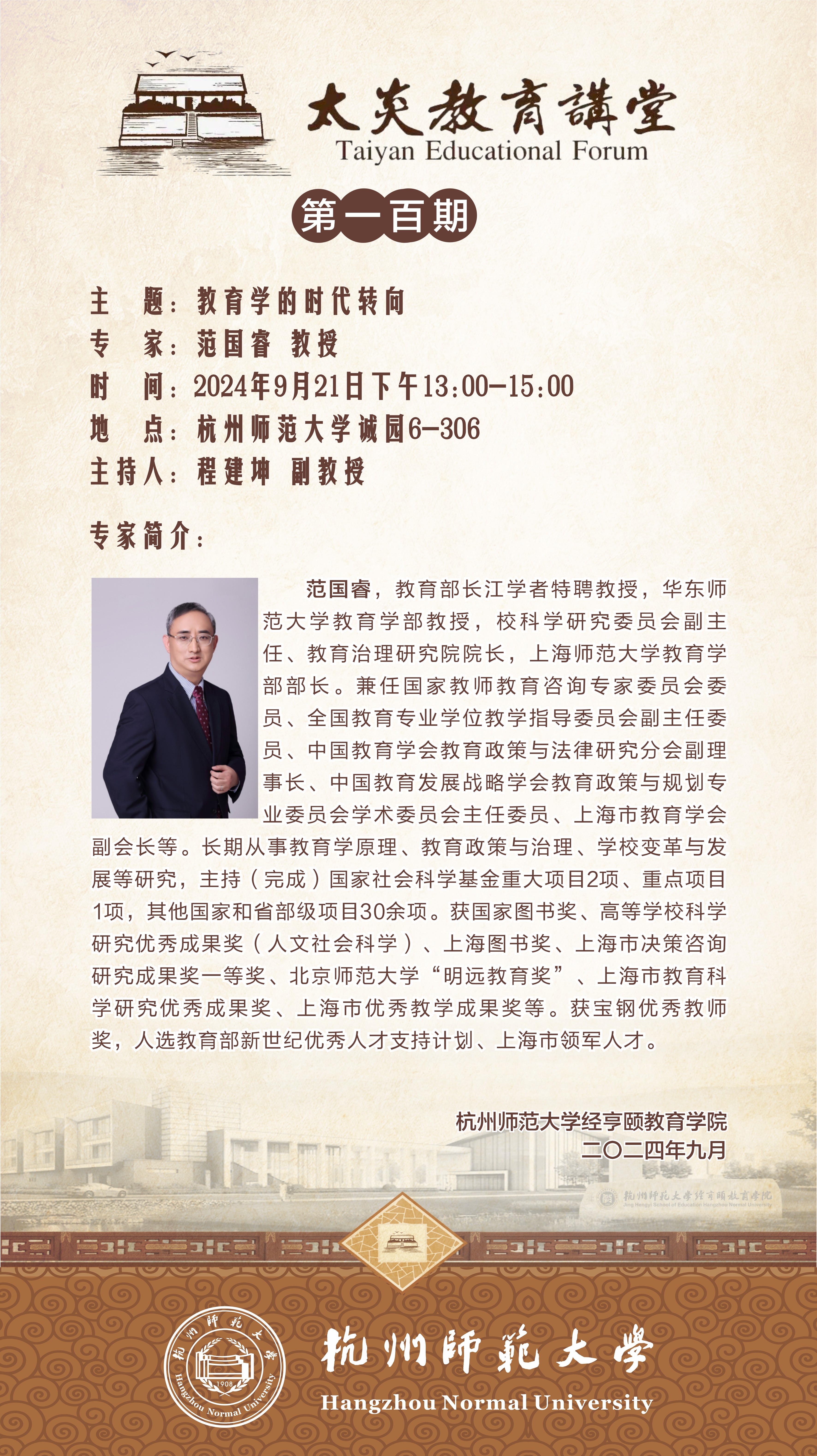 范国睿,教育部长江学者特聘教授,华东师范大学教育学部教授,校科学研究委员会副主任、教育治理研究院院长,上海师范大学教育学部部长。兼任国家教师教育咨询专家委员会委员、全国教育专业学位教学指导委员会副主任委员、中国教育学会教育政策与法律研究分会副理事长、中国教育发展战略学会教育政策与规划专业委员会学术委员会主任委员、上海市教育学会副会长等。长期从事教育学原理、教育政策与治理、学校变革与发展等研究,主持(完成)国家社会科学基金重大项目2项、重点项目1项,其他国家和省部级项目30余项。获国家图书奖、高等学校科学研究优秀成果奖(人文社会科学)、上海图书奖、上海市决策咨询研究成果奖一等奖、北京师范大学“明远教育奖”、上海市教育科学研究优秀成果奖、上海市优秀教学成果奖等。获宝钢优秀教师奖,人选教育部新世纪优秀人才支持计划、上海市领军人才。
