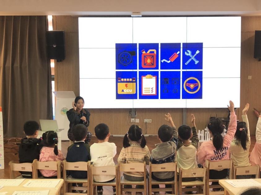 杨嘉滢老师带领小班音乐《开汽车》,孩子们在模拟的驾驶中学习节奏感。