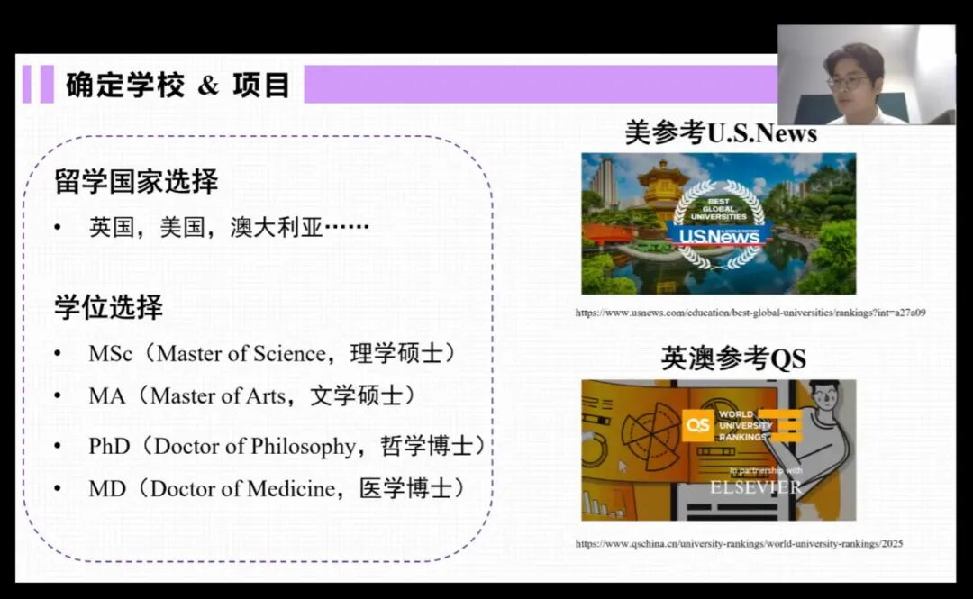讲座伊始,王帅分享了自己的教育经历与成长轨迹。他表示,留学的考虑往往涉及多方面因素,包括学制、课程、费用等。随后,他结合自己的经历,对留学国家的挑选、学校与项目的确定、学校排名榜单的分析等方法做了详细的介绍。通过英美两国硕博项目及申请难度的对比,建议有意向留学深造的同学根据自身情况,选择合适的学校与申请方式。