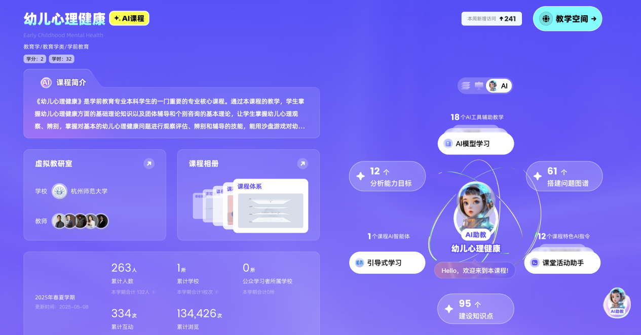 10门课程覆盖小学教育、学前教育、特殊教育、教育技术学、应用心理学等专业,包含7门智慧课程,3门AI课程。在内容建设方面,课程深度融合数字化资源、知识图谱与人工智能技术三要素,构建了体系化、结构化、可视化的知识结构,通过知识脉络更好地展示知识之间的关系和层次,同时搭建知识点学习空间,探索知识点所对应的数字化资源,助力学生系统掌握课程的核心知识点。