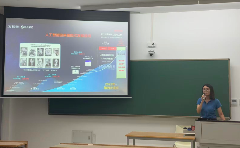 讲座伊始,张梦洁老师从人工智能的发展历程切入,回顾了从1956年达特茅斯会议至今的四次AI浪潮。重点讲解了生成式人工智能的基本原理与技术架构。在案例分享环节,张梦洁老师展示了在语文课中生成式AI的实际应用场景。如教师如何利用AI进行文言词句解析、作者背景介绍、历代评价梳理,并引导学生通过AI生成游记解说词,深化对课文思想内涵的理解。又如何引导学生与AI展开辩论,锻炼批判性思维与提问能力。此外,张老师还系统梳理了AI在“助教、助管、助学、助研”等八大教育场景中的功能,强调“应用为王、场景驱动”是AI落地教育的核心路径。最后,张梦洁老师现场演示了如何通过“星火教师助手”,快速生成教学评语、课堂活动方案、习题设计等内容,让AI成为教师的智能协作者。