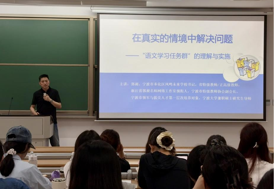 10月13日下午,省特级、正高级教师、宁波市奉化区凤鸣未来学校郭昶书记应邀为桃花族论坛 2024级小学教育语文方向硕士研究生做“在真实的情境中解决问题——‘语文学习任务群’的理解与实施”专题讲座。本次讲座由饶鼎新副教授主持。