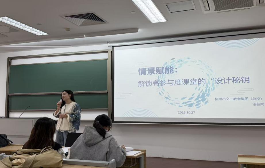 10月27日下午,浙江省教坛新秀、杭州市文三教育集团汤佳绮老师应邀为桃花族论坛 2024级小学教育语文方向硕士研究生做“情景赋能:解锁高参与度课堂的设计秘钥”专题讲座。本次讲座由饶鼎新副教授主持。