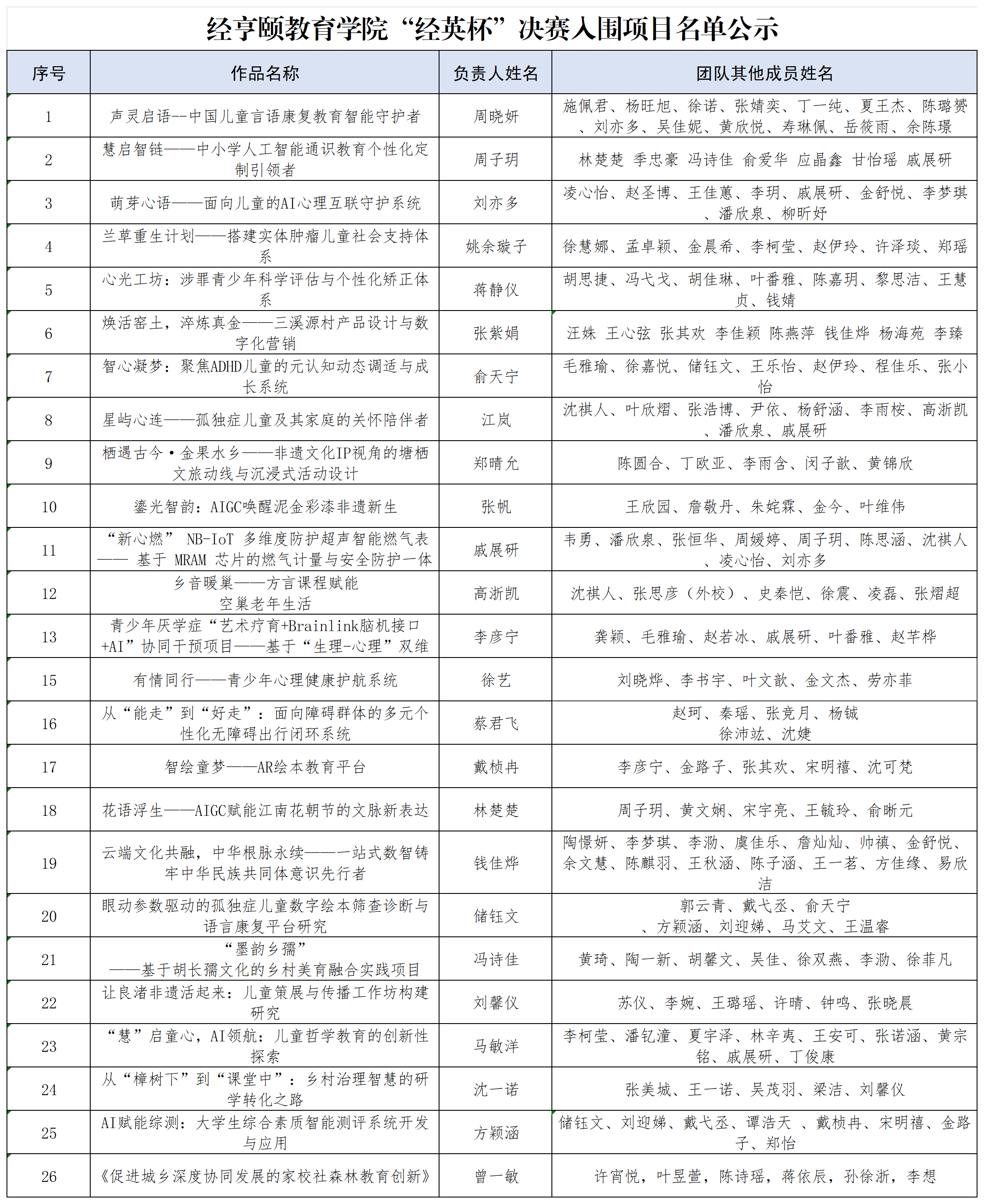 经前期申报桃花族论坛 2025年“经英杯”暨“创新大赛”“挑战杯(希望杯)”竞赛共收到44件作品,经专家评审、学院汇总,最终选出25件作品入围学院决赛,现将入围名单公布如下。