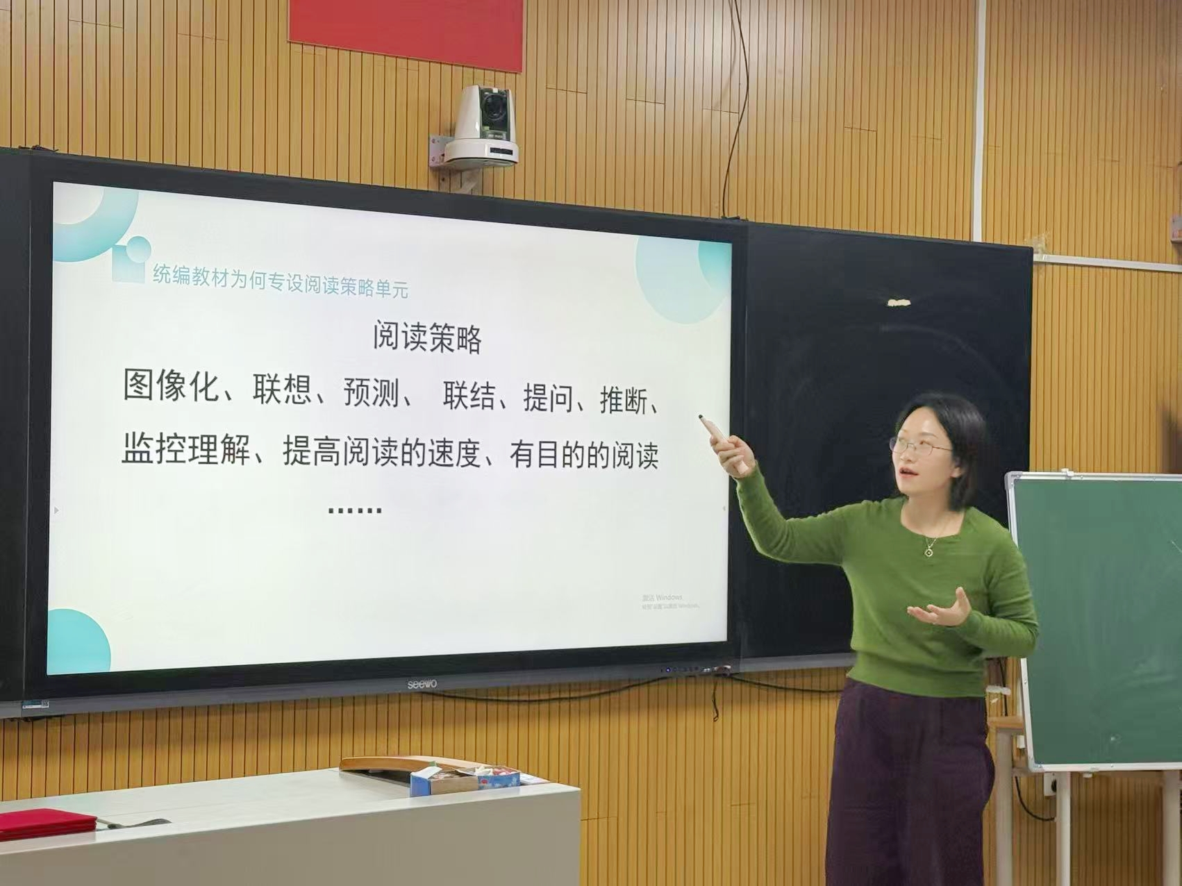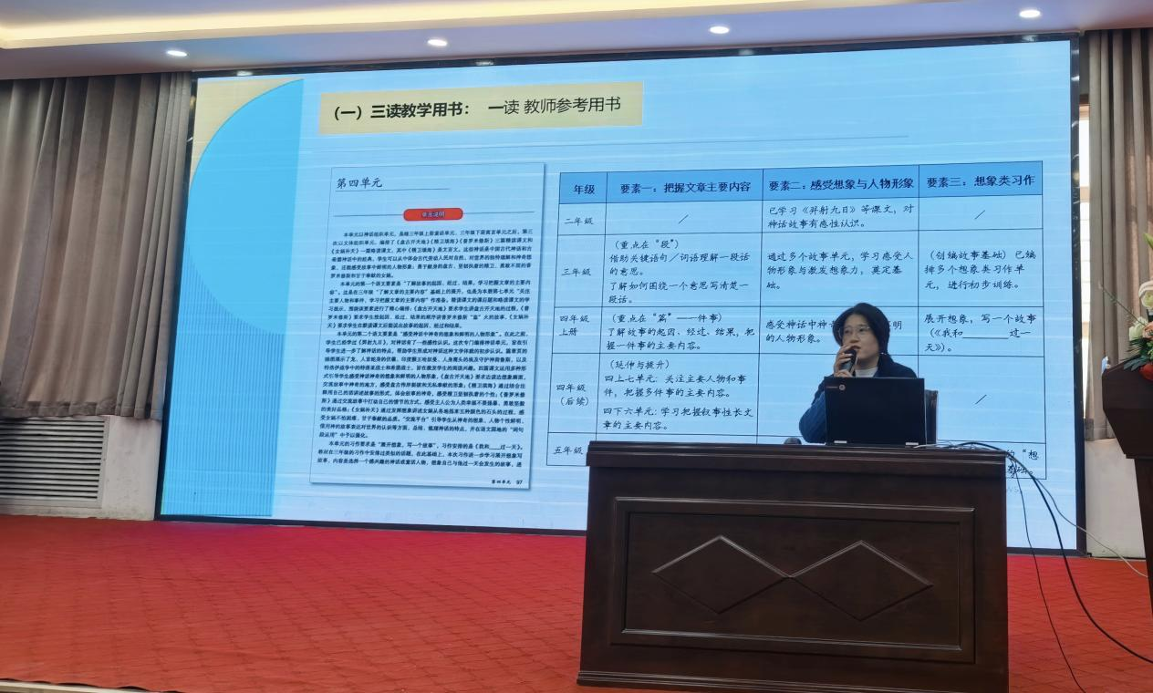 在温宿四中,郑腾雁老师作《阅读策略单元教材认知、教学策略与评价建议》讲座。她系统梳理了三至六年级阅读策略单元的内在逻辑,揭示了“预测—提问—提高阅读速度—有目的的阅读”四个策略之间层层递进的设计脉络,体现了教材对学生阅读能力培养的阶段性、系统性。郑老师指出,成为积极的阅读者不仅需要阅读积累,更依赖策略的熟练运用。讲座具体阐释了如何在不同课文教学中落实相应策略,并提出了“为学习的评价”命题原则,强调通过科学命题引导学生自我监控与策略调整,真正实现从“教会”到“会用”的转化,为阅读教学提供了扎实的理论支撑与实践路径。