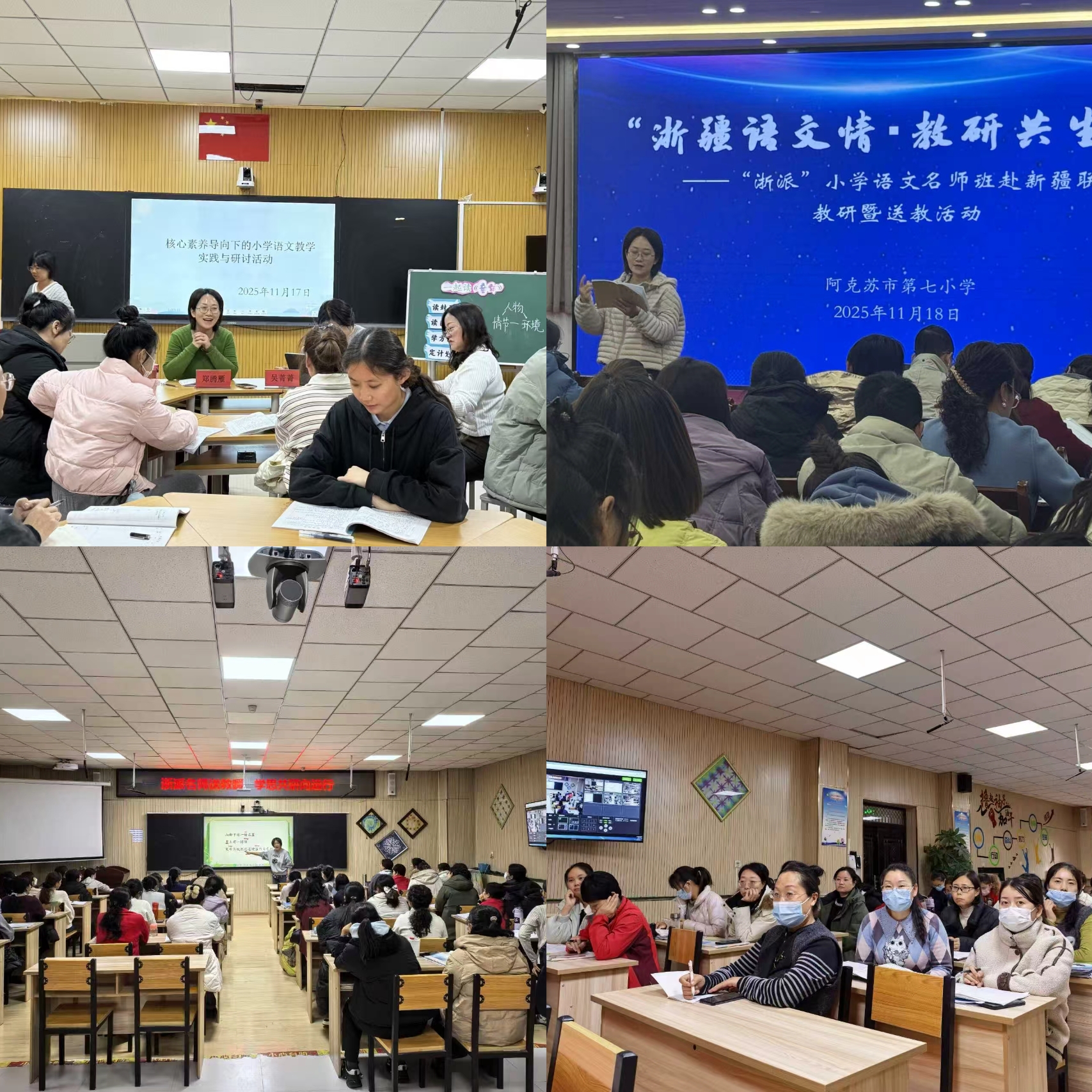 为深入贯彻《义务教育语文课程标准(2022年版)》精神,推动阿克苏地区小学语文“新课标、新教材、新教学”的深入实施,2025级的“浙派”小学语文名师柔性援疆活动,在项目负责人黄金丽博士的精心对接与安排下,于2025年11月13日至19日在新疆阿克苏地区成功举行。活动期间,浙派名师团队深入阿克苏市第四小学、阿克苏市第七小学、温宿四中等一线学校,开展了形式多样、内容丰富的教研活动。活动通过高水平的专业引领与深度教研交流,提升当地教师的课程实施能力与教学研究水平,促进区域教育优质均衡发展。