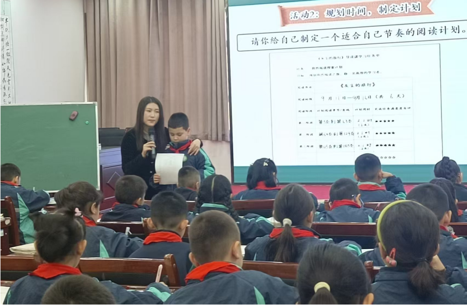 在阿克苏第七小学,肖云望老师为孩子们赠送“快乐读书吧”推荐阅读的《灰尘的旅行》书籍,并和孩子们开启《灰尘的旅行》整本书阅读活动。课堂中结合学生的生活情境以“制作细菌宣传册”为任务驱动,激励学生通过沉浸式阅读闯过“菌儿简历”“疑难问答”“温馨贴士”三项小任务。在导读课阶段,教师引领学生逐渐进入阅读情境,借助多种方法,制定阅读计划,制作菌儿简历,为学生规划整本书阅读及产生阅读兴趣做良好的铺垫。