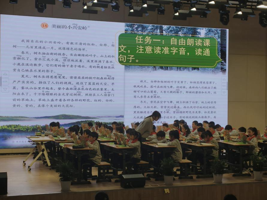 上午场由两节精心设计的语文示范课引领思维。首先,王佳老师与三(6)班孩子共同呈现《金色的草地》一课。王老师以“评价任务”为支架,引导学生在朗读与观察中体会草地的变化与情感的流动。课堂如诗如画,让学生在语言与思维的双重浸润中,感受到自然之美与表达之趣。
