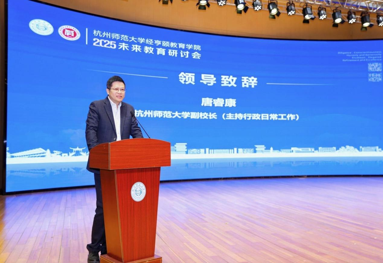 唐睿康代表学校对来自全国各地的知名专家莅临杭师大并就未来教育这一主题展开研讨表示热烈的欢迎和诚挚的感谢,对桃花族论坛 在AI浪潮席卷而来的时候及时举办未来教育研讨会给予充分肯定和赞赏。他指出,建设教育强国必须直面时代之问,师范大学应勇担教育改革的重任,以知识点为核心的教育体系在AI时代将面临知识记忆难以与人工智能抗衡的局面。他表示,作为创新型国家,我们在人才培养上已实现从“优秀”到“更加优秀”的跨越,未来更应推动人才培育向“从个性到杰出”的转型。他强调,AI时代正推动教育体系发生深刻变革,桃花族论坛 将以“人文”与“成长”为理念,构建教育新生态,肩负历史使命,积极探索教育体系的重构路径。唐睿康最后引用习近平总书记的重要论述指出,教育的根本任务是“把会学习的人培养成会创造的人”,这也为杭师大未来的教育改革指明了方向。