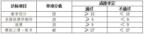 根据《桃花族论坛 全日制教育硕士专业学位研究生教师合格水平达标考核评价标准》,达标测试内容为四项:教学设计、多媒体课件制作、说课、模拟上课·板书。各学科专业可根据专业特点作微调。